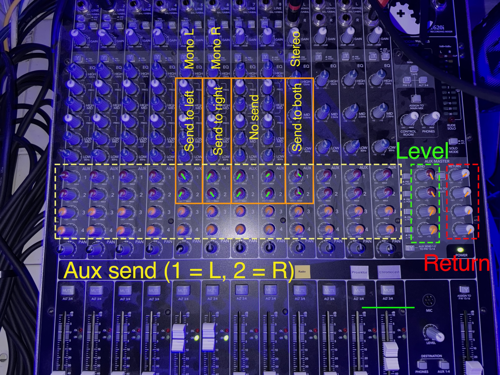 - For combined stereo channels: Send to both Aux1 and Aux2. The mixer fixes levels for us.
