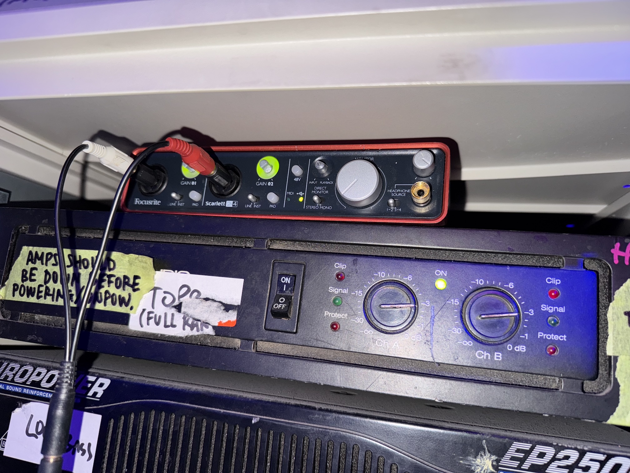 - Align the levels so that we do not redline the audio card in the mix rack (ring around the gain knobs on the Focusrite, see image below)